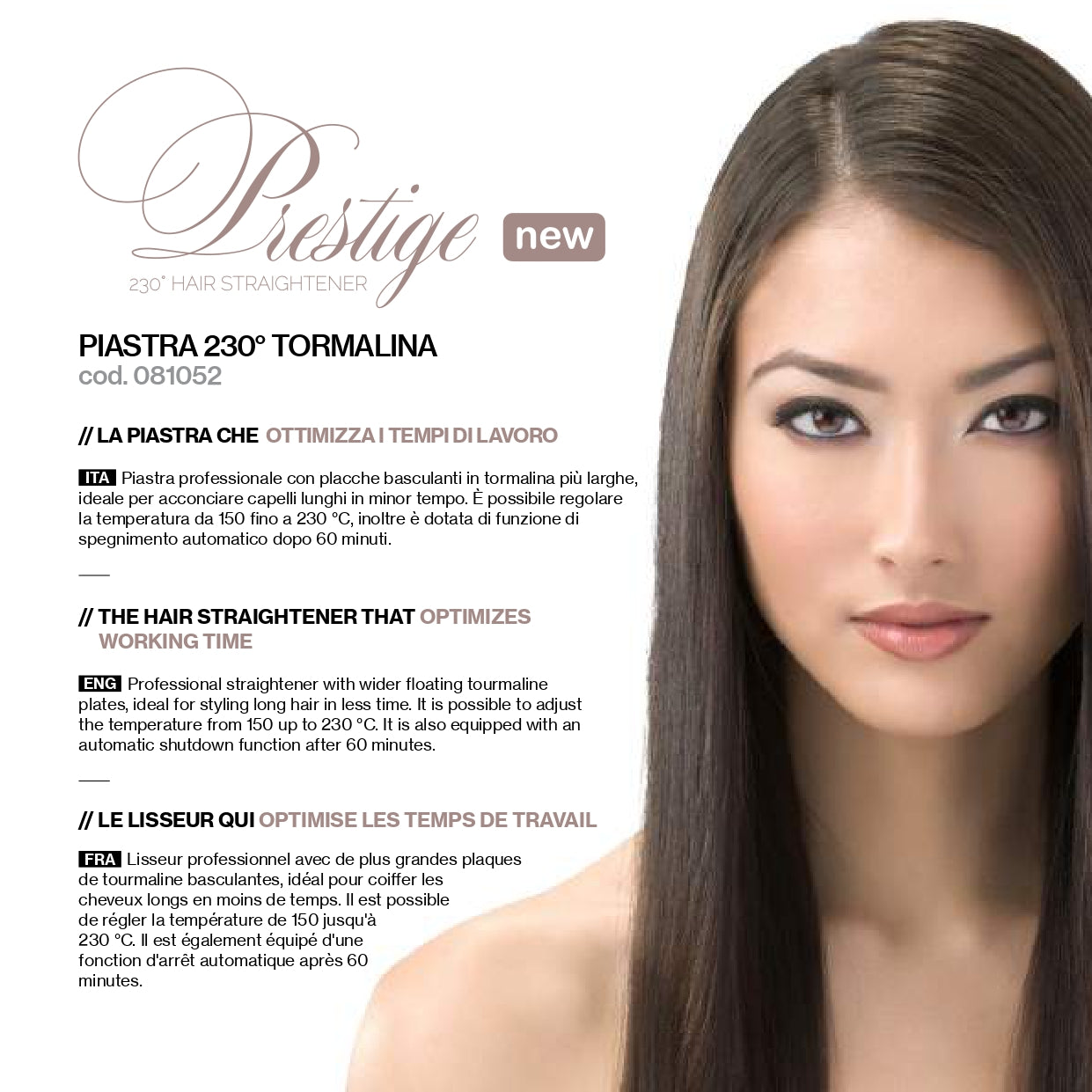 Piastra professionale con placche basculanti in tormalina più larghe, ideale per acconciare capelli lunghi in minor tempo. È possibile regolare la temperatura da 150 fino a 230 °C, inoltre è dotata di funzione di spegnimento automatico dopo 60 minuti.